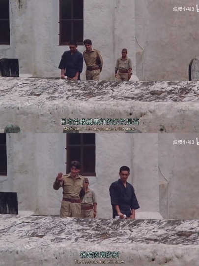 这部电影多用固定镜头,镜头调度和剧情节奏上面略显普通,基本都是户外拍摄,采光布景好像也没有很讲究,看起来更像是纪录片的质感。但是它还是挺先锋的,比如故事背景——印尼爪哇岛的战俘营,比如人物关系——战场中不同种族/同性之间的时间复杂情谊,比如日本民族的特点等等… 最后,真的很想去日本看雪啊!!