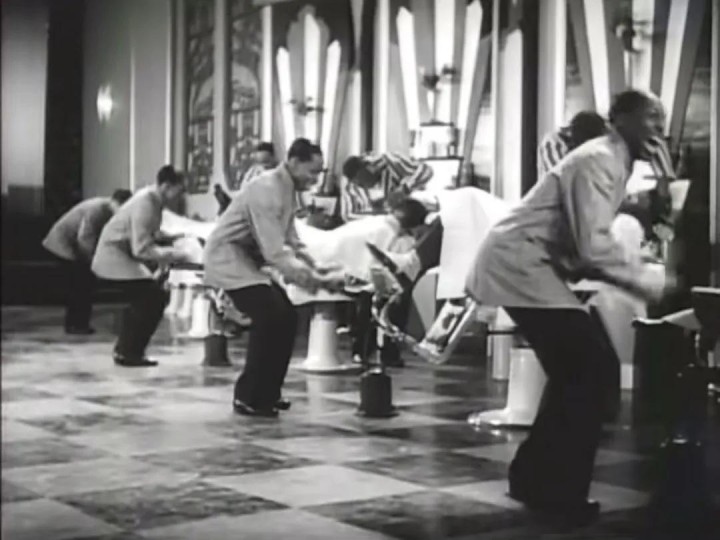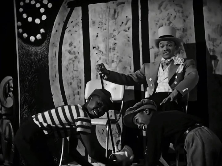 为黑人,通过擦鞋发出的声响与脚下踢踏舞的踏击音来表达节奏,顾客则作为互动载体触发舞蹈动机。舞段中的黑人演员勒罗伊·丹尼尔斯(LeRoy Daniels)本质并为非职业舞蹈演员,而是一名会跳舞的擦鞋匠。“明奈利发现了勒鲁瓦·丹尼尔斯,一个边干活边唱歌跳舞的擦鞋匠,丹尼尔斯干活的方式不仅为这出歌舞提供了灵感,而且他本人也被邀请到好莱坞和阿斯泰尔共同演绎。”[4]丹尼尔斯的身体语言透露出明显黑人民间社交舞蹈的气息,其表演方法论有明显的早期黑人爵士舞核心特质:即兴情绪的使用。