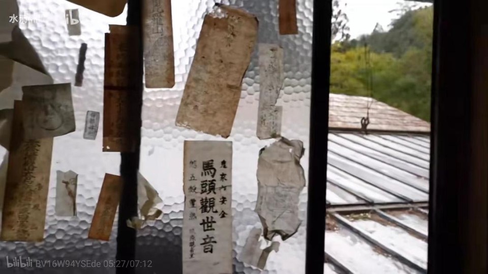 玻璃上贴着马头观世音的符咒→