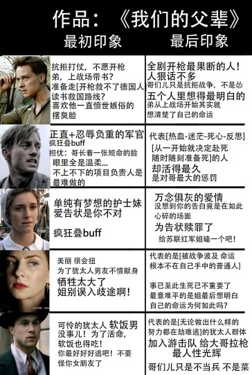 关于作品名:这部德语原名是《我们的母亲 我们的父亲》,中译由于忽略了母亲的翻译而备受争议。但鉴于中文语境实在没有“母辈”的说法,本川渝人给出翻译建议《我们的老辈子》☺️ 关于角色:每个人的人物弧光都塑造得实在太好,不同的经历造成不同的意识形态,活下来的人又在经历不同类型的战后创伤。 关于内容:相当精彩彻底的反战反思。二战时期德国自上而下的意识形态是怎么形成的。怎么转变的。到底在为什么而战