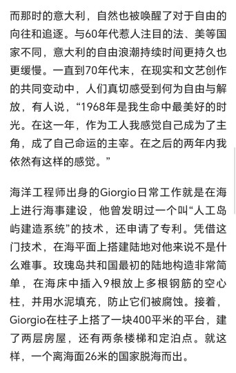 那个男主角的原型,着实是一个了不起的人才。不仅是作为工程师能力超群,研究出了建岛的技术专利,而且想出在公海上建立一个迷你的独立国家的主意并且把它变成现实,思维就很出类拔萃。 历史真实并不是为了爱情和女人,电影改肤浅了。如果为了这个,意大利政府也不会那么紧张地要去威胁他,并最终摧毁了这个小岛。那个乌托邦,是一个思想阵地,是一种意识危险阵营。 本来冲突可以拍得更严肃更激烈一些,更接近事实会更震撼更有冲击力。可是电影的戏剧化让这个结局有了闹剧的味道,削弱了效果。 电影中内政大臣派人收买男主,提出条件说:你现在在岛上经营有未成年人参与的酒吧(实际还有裸体派对),那是违法的。如果你放弃岛上的酒吧餐厅,我们可以给你两家岸上的酒吧餐厅。你可以和原来一样想做什么做什么,只不过要在岸上。你如果担心交税的问题,你以为这些餐厅都交税吗?这是有些讽刺意义的。
