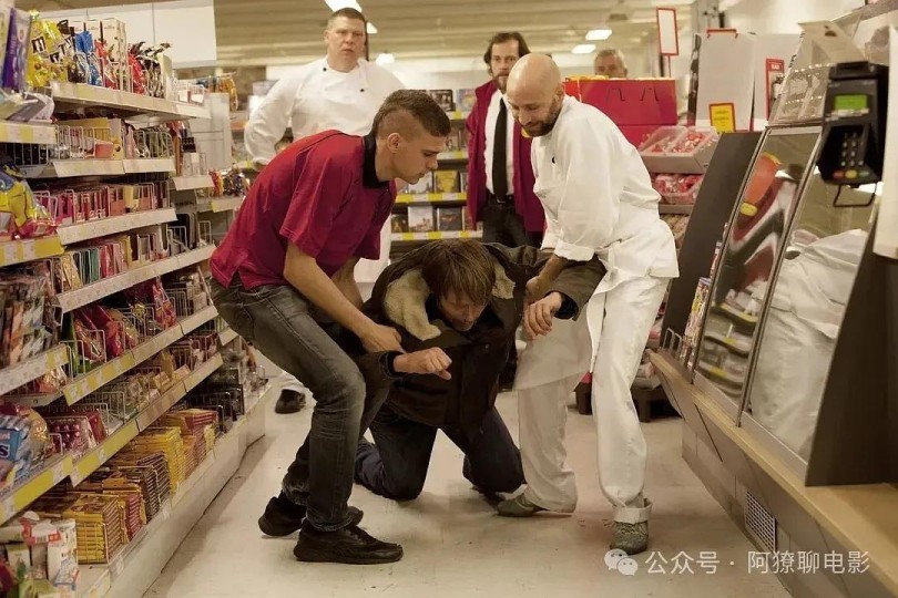 在《狩猎》中,卢卡斯的生活迅速崩塌。尽管他坚称自己无辜,但小镇居民选择集体排斥他:超市拒绝为他服务,好友与他反目,甚至有人向他家扔石头。法律程序尚未启动,社会性死亡已然降临。