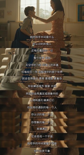 这部电影给出的回答是:我们本身充满奇迹,我们值得拥有精彩的人生。我们包罗万象,拥有无限可能。我们思考,因此我们是宇宙的中心;我们生活,因为不愿虚度此生。