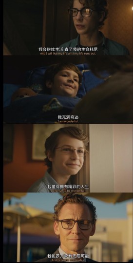 很久以来第一次这么沉浸式点看完了电影。电影采取倒叙方式,直到最后的第一幕,才明白第一幕是什么意思。第三幕的世界末日,各处的灾难,意味着查克的世界逐渐消亡,而他也走向死亡;第二幕讲述了查克的童年;第三幕讲述了查克再一次打开了阁楼看到的东西。(原来之前爷爷一直不让查克打开阁楼是有原因的),查克打开阁楼的门后,看见了他的死亡,但是不知道在什么时候。所以他爷爷说的那句话“等待是最煎熬的。”