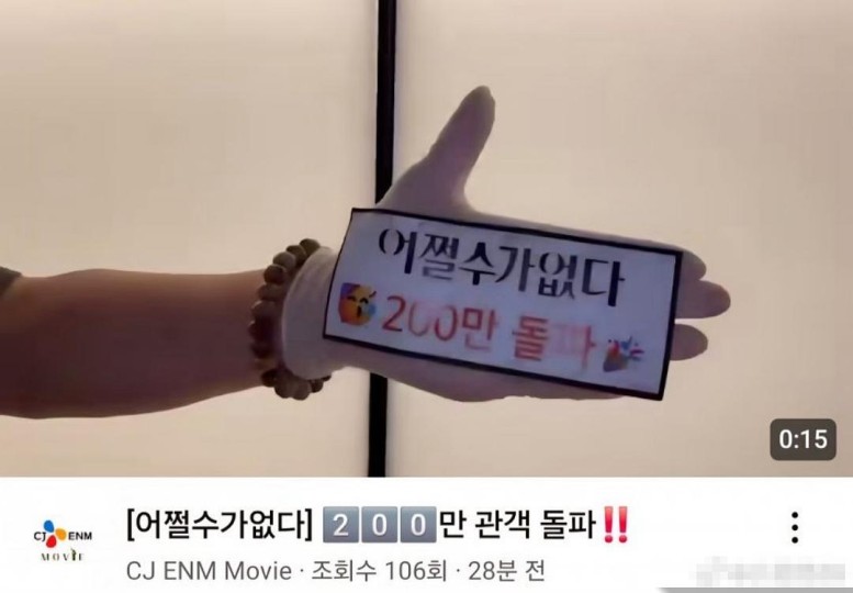 10月6号,《无可奈何》在上映13天后观影人次超过200万名,发行公司CJ官博发了认证视频: