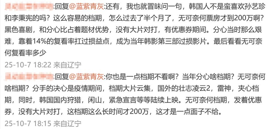我看了之后惊讶《分心》在韩国的票房居然不高。依它在国际上的声誉, 让朴赞郁在戛纳拿了最佳导演奖,在韩国国内男女主角都拿了最佳演员,在中国也有非常高的谈论度,B站上拉片分析的视频有几十个,这样一部电影,韩国人居然不领情。他们哪里不满意啊,故事蛮好看的,毕竟戛纳都盖章了。汤唯他们不是也蛮喜欢的吗。于是在微博上发了一条: