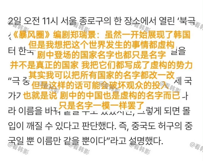 郑瑞景坦言因自己创作的台词使主演全智贤受到波及,感到“内疚且沉重”。她表示,这句台词确由自己所写,但剧集本身是建立在“完全虚构”的世界观之上,和现实国际格局无直接对应:“如果可以,我真希望能为剧中所有国家起一个虚构的名字。”她强调,《暴风圈》的设定更像是一部带有科幻性质的政治惊悚剧,“并非针对任何现实国家”。