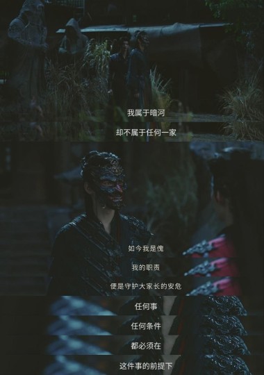 苏暮雨的两面上来就很直白: 一,他武力了得,行动果断,守护大家长的目标坚定; 二,他内在其实很迷茫,出场第一句词,类似to be or not to be,质问的是执剑的意义。这里,演员表演极为精准,疲惫、茫然。 而这却并不是通过台词和旁白解说,而是通过画面呈现——面具。 开头质疑自己时,他没有戴面具。得知大家长处于险境,戴上面具=人格切换。 更精彩的是,第1️⃣集结尾苏暮雨和苏昌河的对话,他一直戴着面具,他说—— 如今我是傀,我的职责便是守护大家长的安危。任何条件都必须在此前提下。