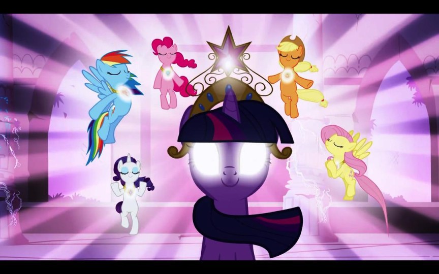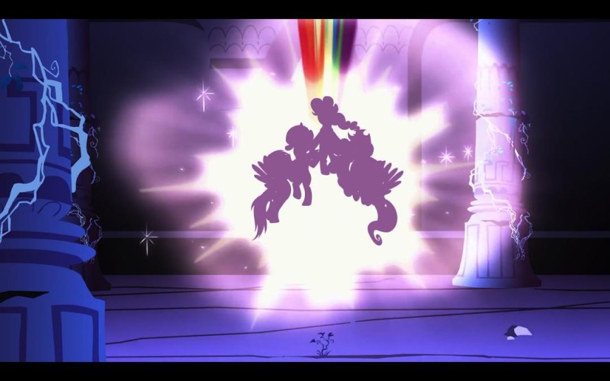 小马宝莉每季的首尾都有战斗番的属性,但由于梦魇之月实在是不给力,战斗过程确实略显草率。言而总之,胜利后,大公主出现,blahblah一通。小马宝莉的世界观就这么形成了!