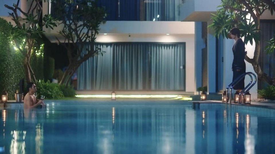 泳池里的对望,暗示两个人之间的鸿沟和试探: