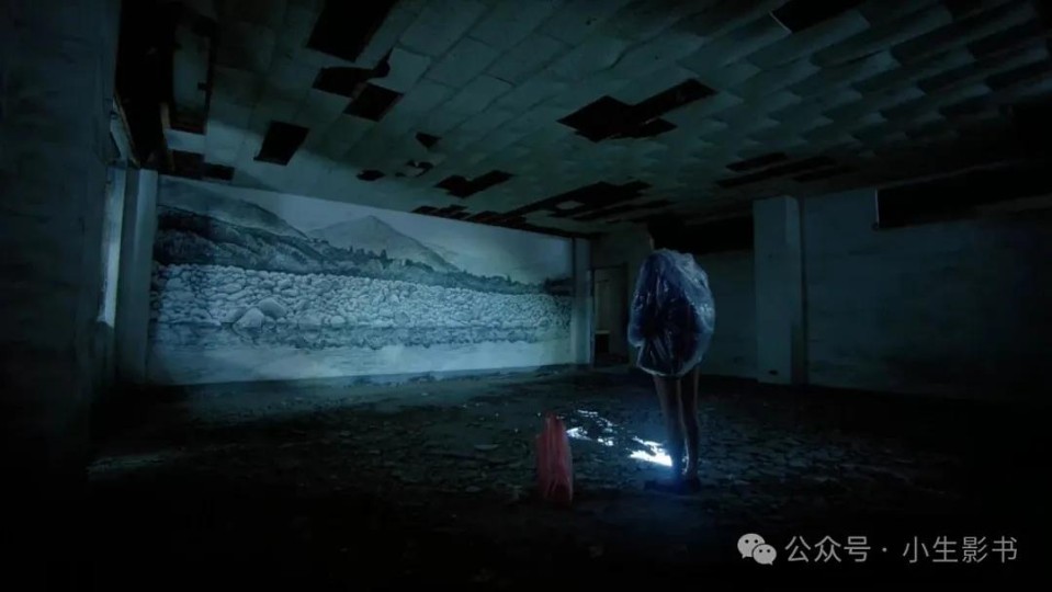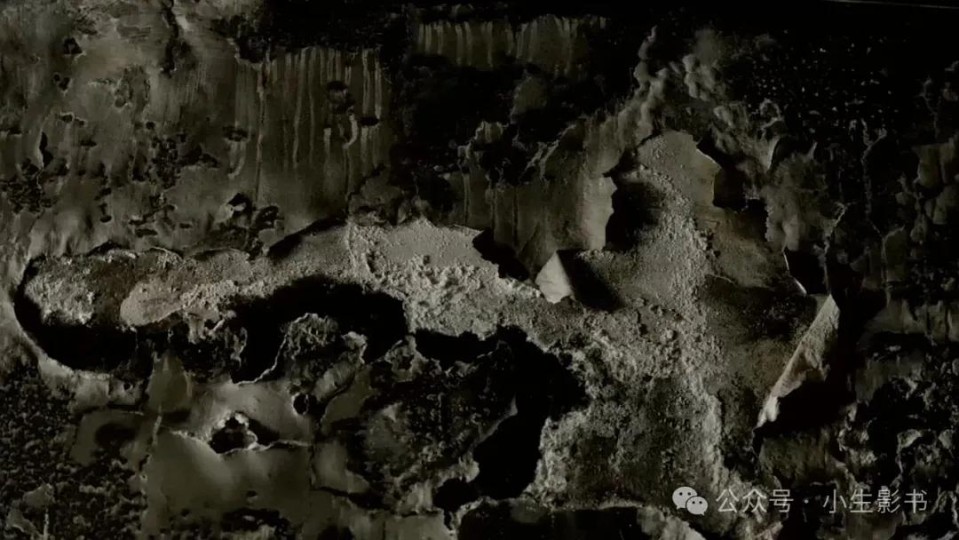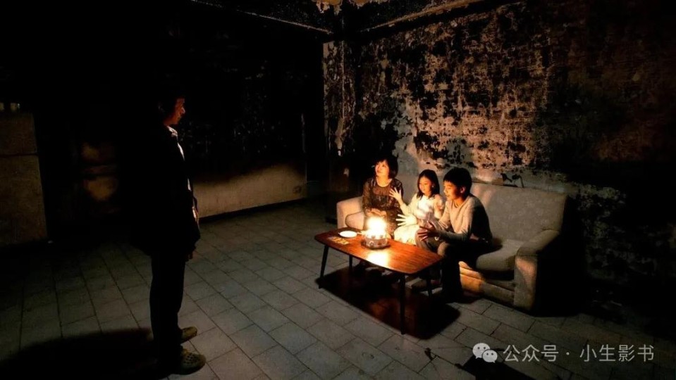 斑驳的空间,四处开裂的墙像是被大火席卷而过,焦黑的水从墙缝中渗出。女人对女儿说,这是房子流出的眼泪。桌子、凳子、茶几,家具简单到像是舞台的布景,点燃的生日蜡烛像是这个家庭唯一象征幸福的点缀。