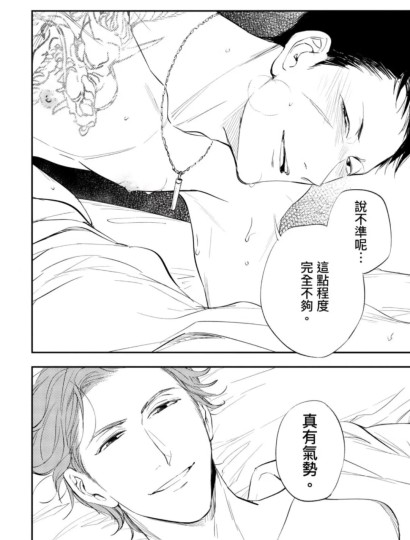 第三次是两个小混混追车的时候,但是原著的第三次就出现在【初夜】的宾馆里,是攻对受说的,参考拉面馆的那句,这就意味着攻知道对方是在挑衅他,而且他马上就要开始报复了。呃,众所周知,男人不能说不行,尤其是不能在床上说他不行,更何况,这还是个尤其好面子的黑道大哥,攻不在这里找回场子他就跟受姓(当然要找回了那就是受跟他姓了)。结果是可想而知的,事实上受就是被攻搞得晕过去了,但是作者在这里做了个蒙太奇剪辑,晕死的部分被剪掉了,于是读者看到的是上一页攻还在把受往死里整,然后枪声响起,下一页,就是攻躺倒在血泊中的光景,然后受伸手触摸攻头上的伤口,一边喘着粗气一边慢慢地把沾着鲜血的手指含进了嘴里……