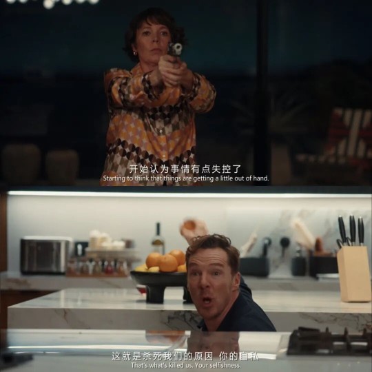 而后半部上演的惊涛骇浪,才是矛盾爆发的高潮所在:无论是新房乔迁之宴时在朋友面前不留情面的彼此诋毁、不留底线的恶言相向,还是打离婚官司时在“爱房”和“爱我”间你死我活的互相伤害,乃至最终上演“英女王”枪战“福尔摩斯”的精彩大戏(这场戏让我想到了《史密斯夫妇》),如此撕裂的反差感想必也只有两位资深实力演员能hold住了。